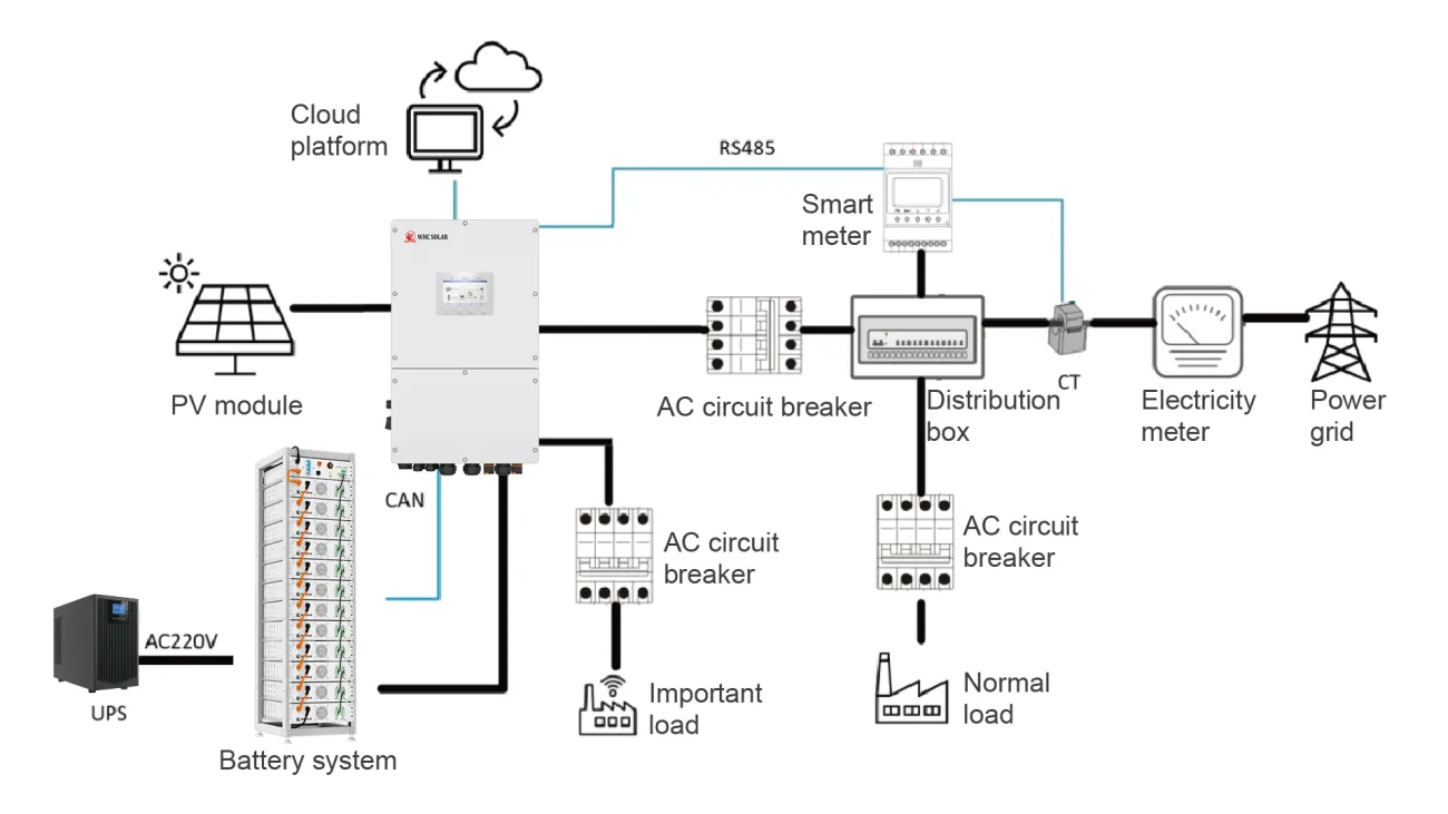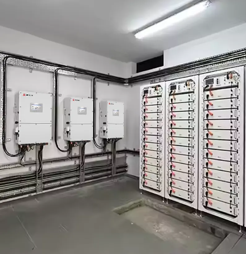 30KW-61KWH Solar Industrial & Commercial ESS: Prioritizes PV energy, grid supplements when insufficient; PCS charges 61KWH battery (BMS-protected), inverts 30KW for loads to cut peak costs, acts as backup if grid fails; backend controls for peak-valley arbitrage & emergency backup.